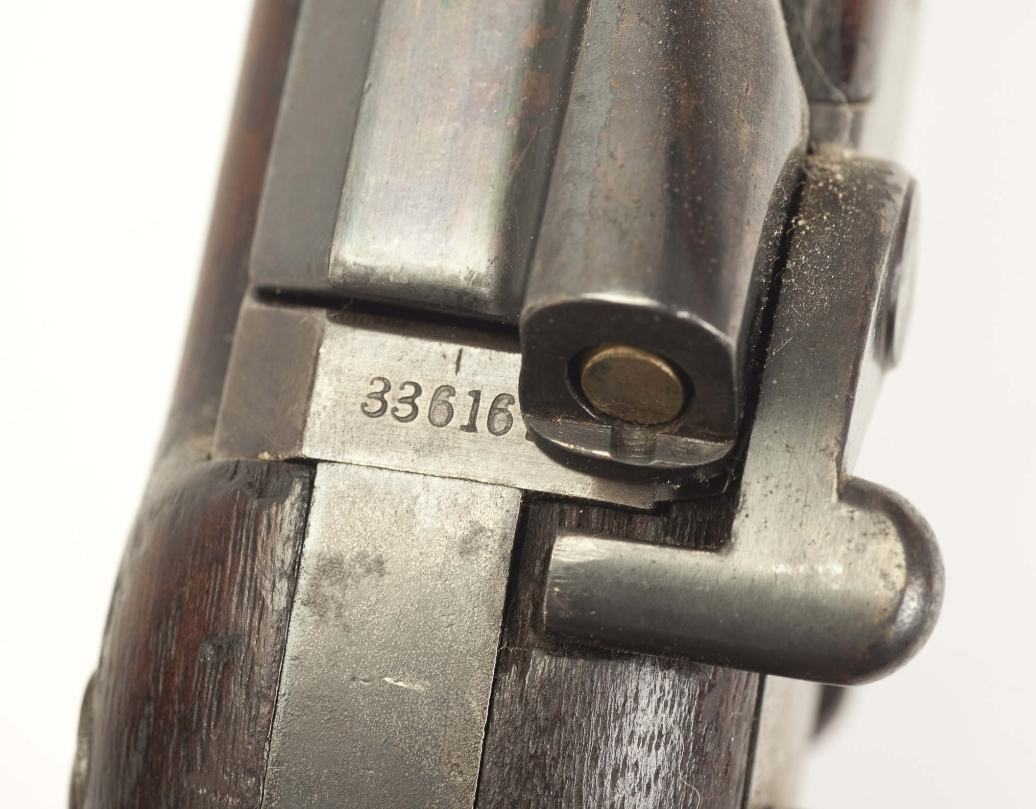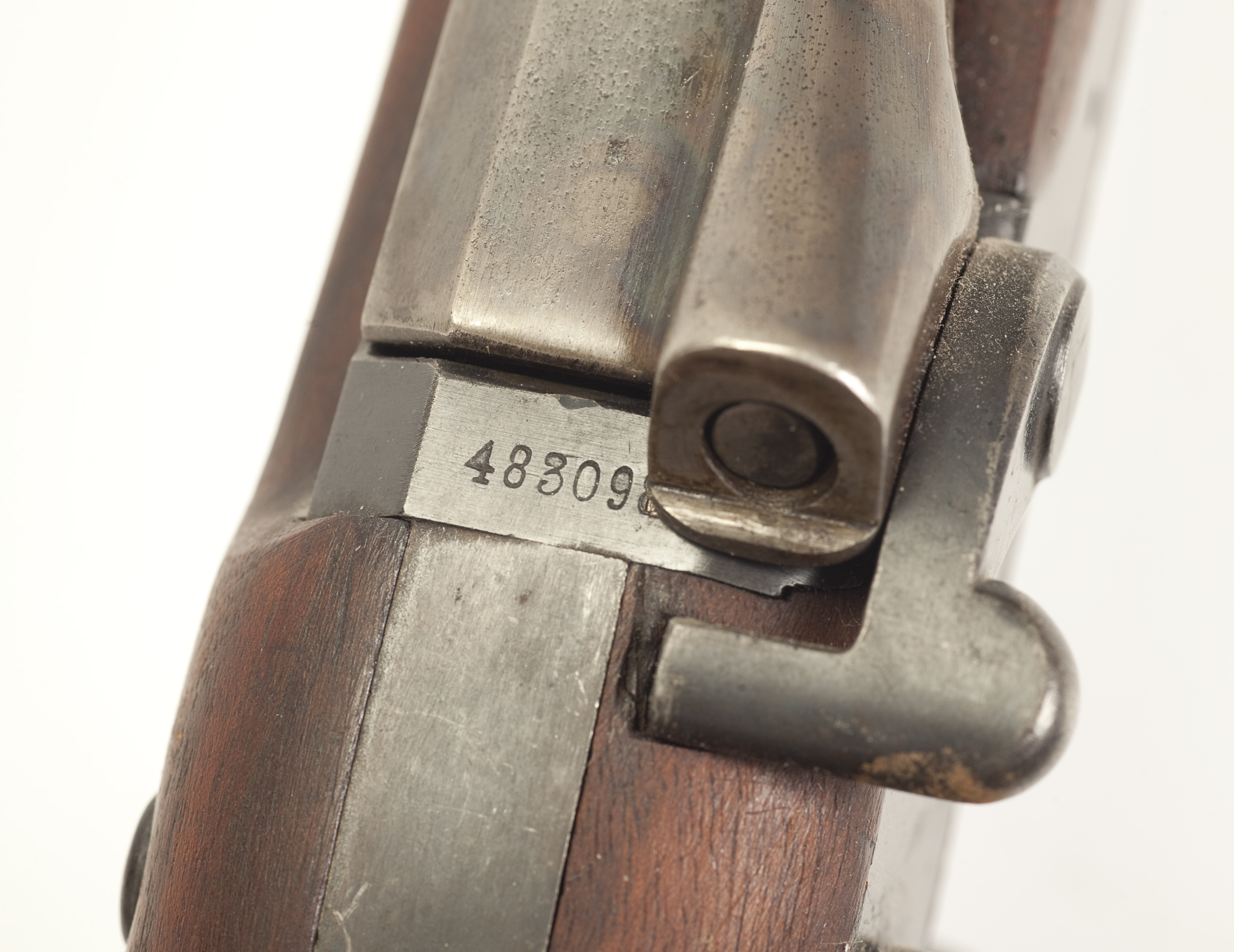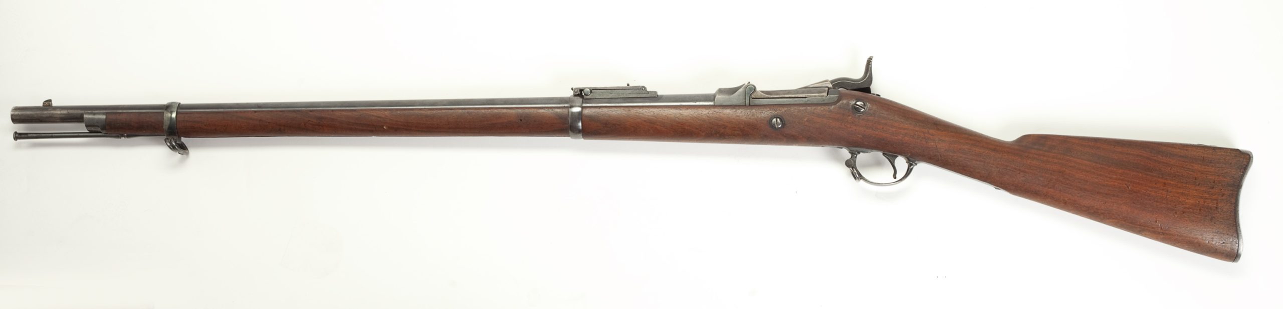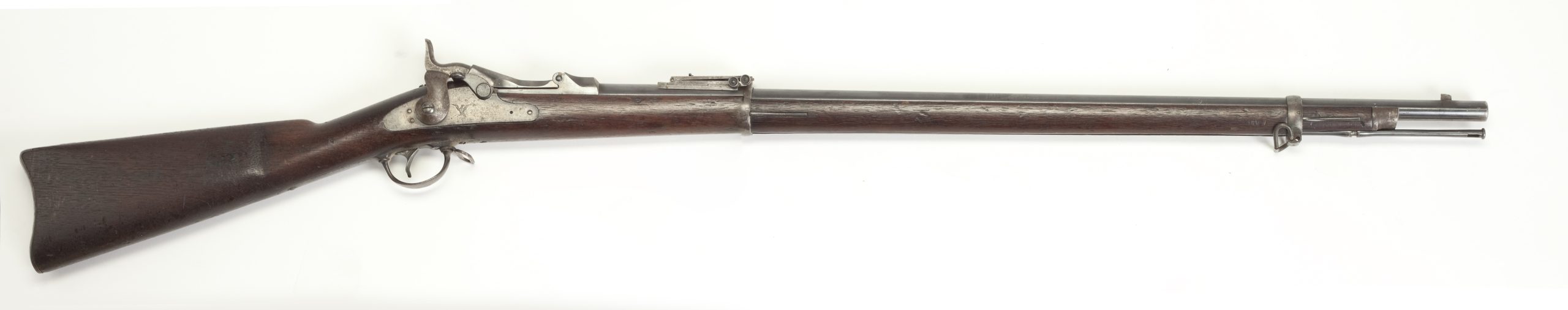 Description: The Springfield Trapdoor Cartridge Rifle was produced for the military in 1873. It was a redesign of the Army’s Allin Trapdoor rifle. The Springfield Trapdoor held the new, more powerful .45-70 military cartridge. Full-stocked 32 inch barreled rifles. The condition of this firearm fine minus with small dings and scratches.